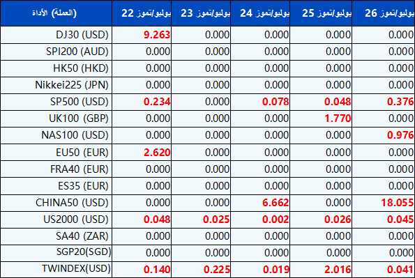 يرجى العلم أنه سيتم تعديل الأرباح المستحقة للمؤشرات التالية لـ CFDs بناءً على التواريخ القادمة للأرباح المستحقة. سيكون التعليق على تداول المؤشرات CFDs في النموذج التالي “Div&<Product Name>&<Net Volume>” الذي يظهر في الرصيد بعد نهاية اليوم الذي يسبق تاريخ دفع الأرباح.