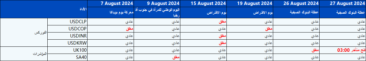 يُرجى العلم بأن ساعات تداول الأدوات المالية التالية وأوقات جلسات السوق ستتأثر بعطلة آب القادمة.