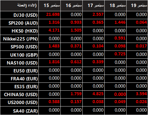 يرجى العلم أنه سيتم تعديل الأرباح المستحقة للمؤشرات التالية لـ CFDs بناءً على التواريخ القادمة للأرباح المستحقة. سيكون التعليق على تداول المؤشرات CFDs في النموذج التالي “Div&<Product Name>&<Net Volume>” الذي يظهر في الرصيد بعد نهاية اليوم الذي يسبق تاريخ دفع الأرباح.